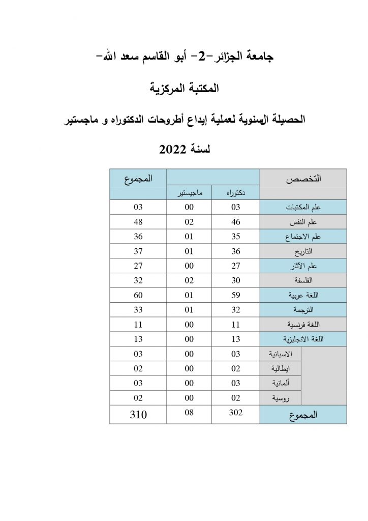 الحصيلة السنوية لإيداع دكتوراه وماجيستير لسنة 2022