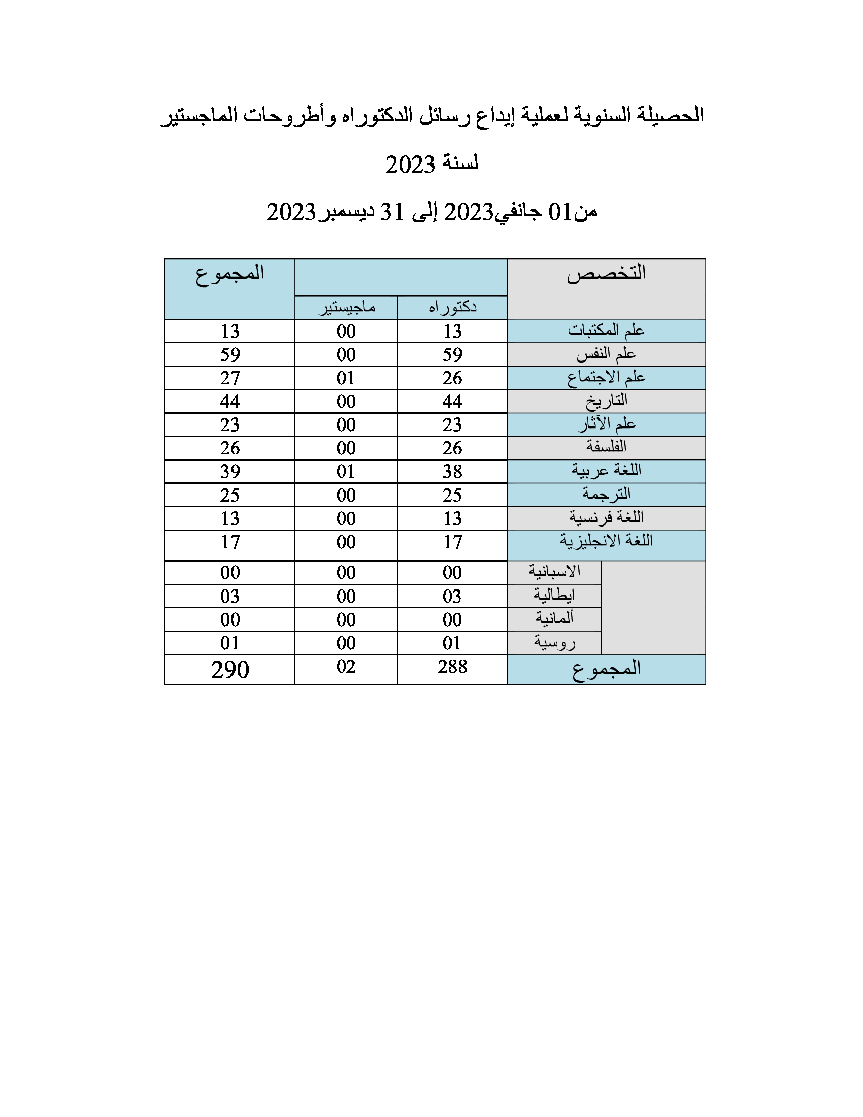 الحصيلة السنوية لإيداع دكتوراه وماجيستير لسنة 2023